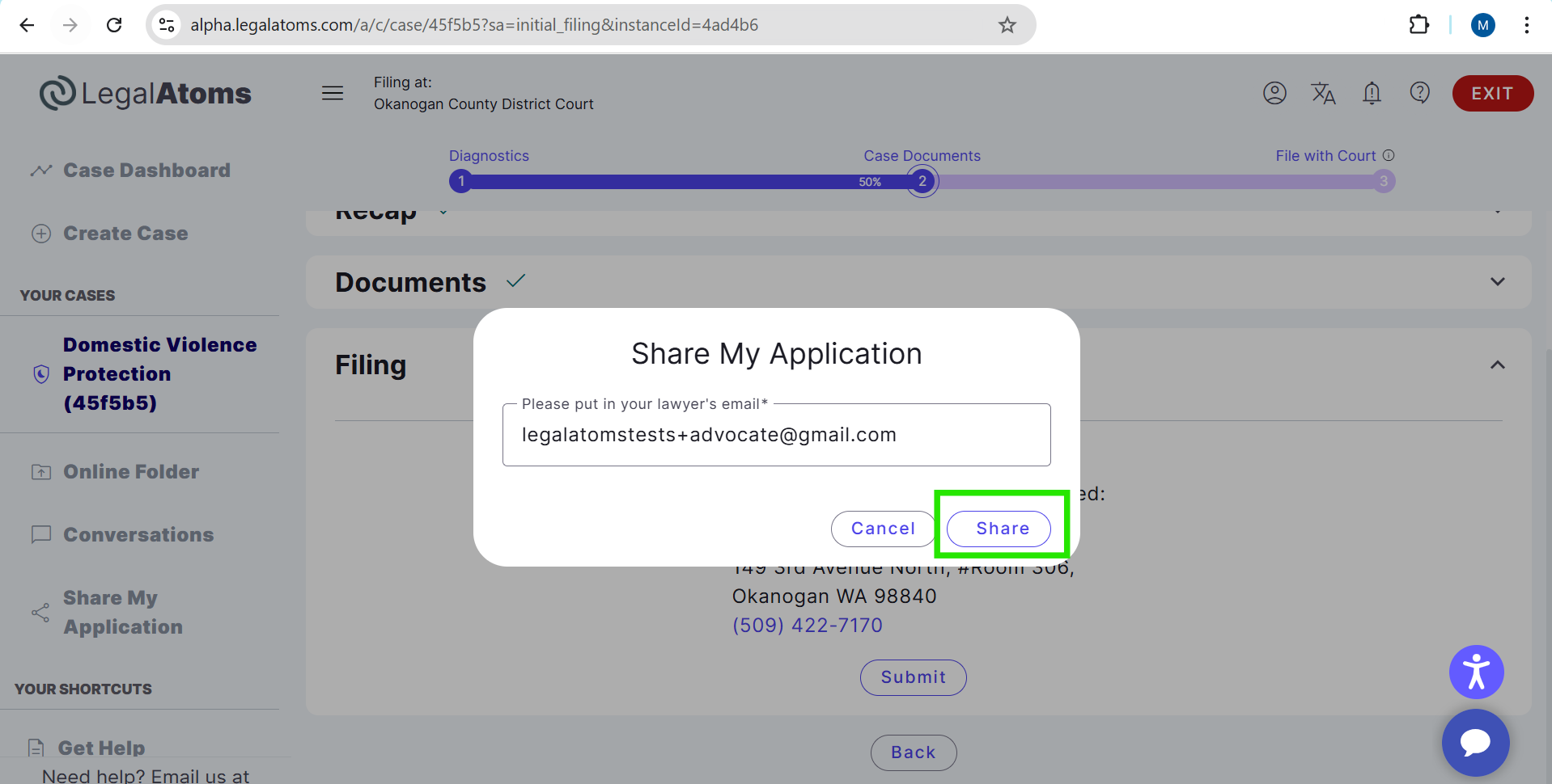 A pop-up window appears. In the provided field, the client enters the email address of the nonprofit or advocate they wish to connect with. After entering the email, the client clicks Share to send the connection request.