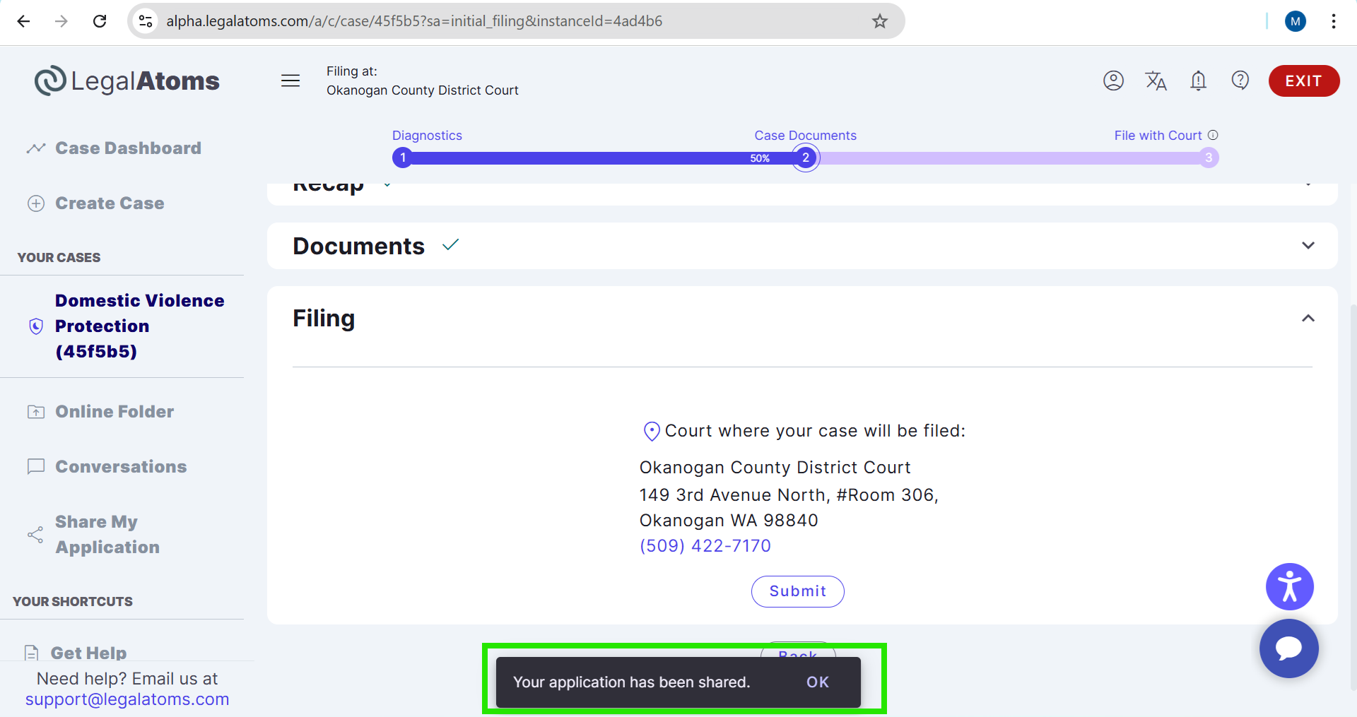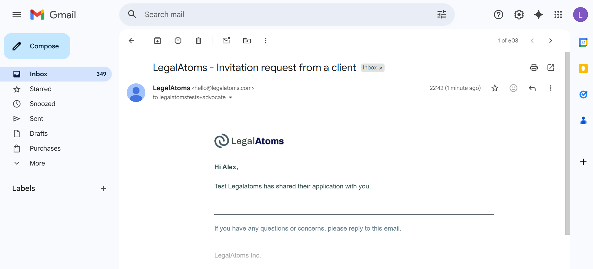 LegalAtoms automatically sends both an email and an in-app notification to the nonprofit’s account, informing them that the client has shared their application.