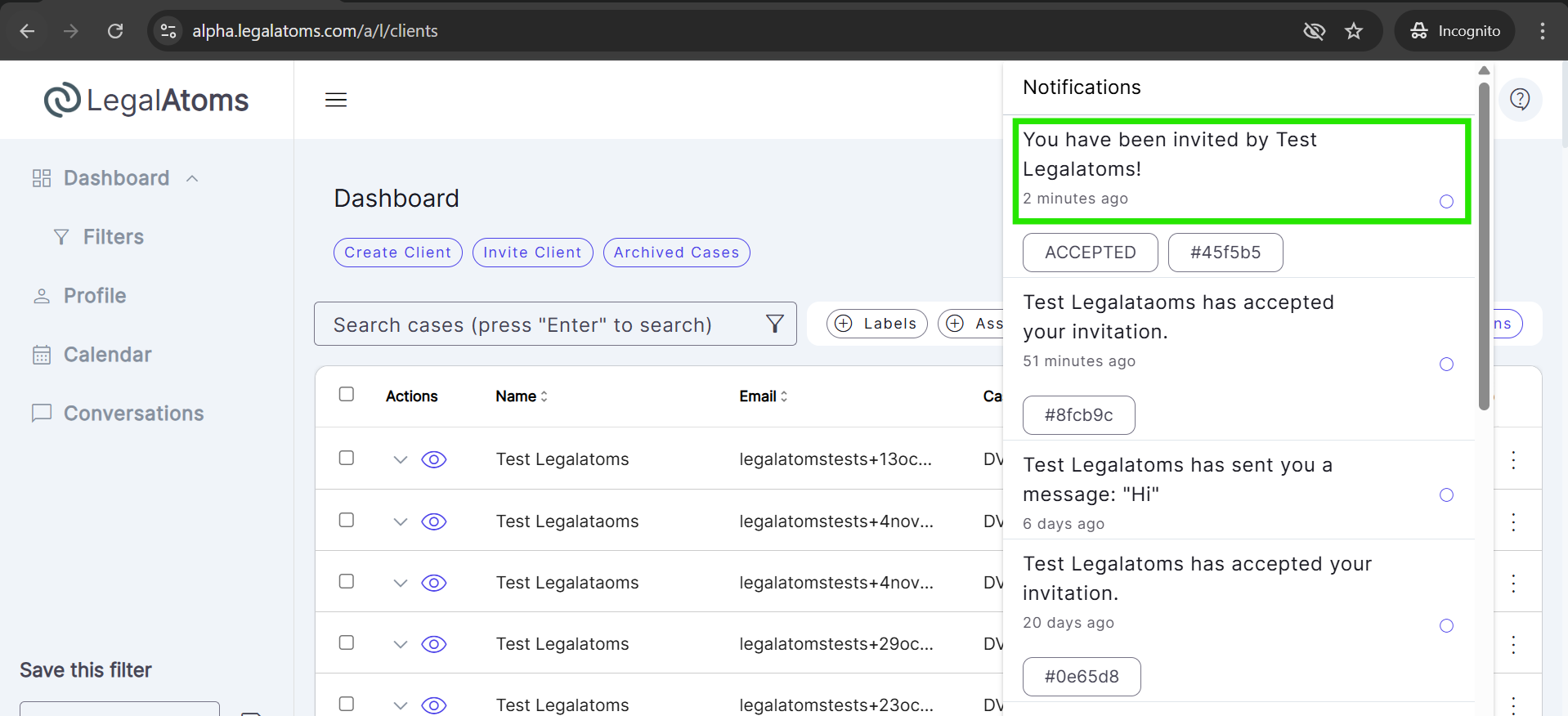 The client can click Accept in their email or directly from LegalAtoms notifications At this point, LegalAtoms