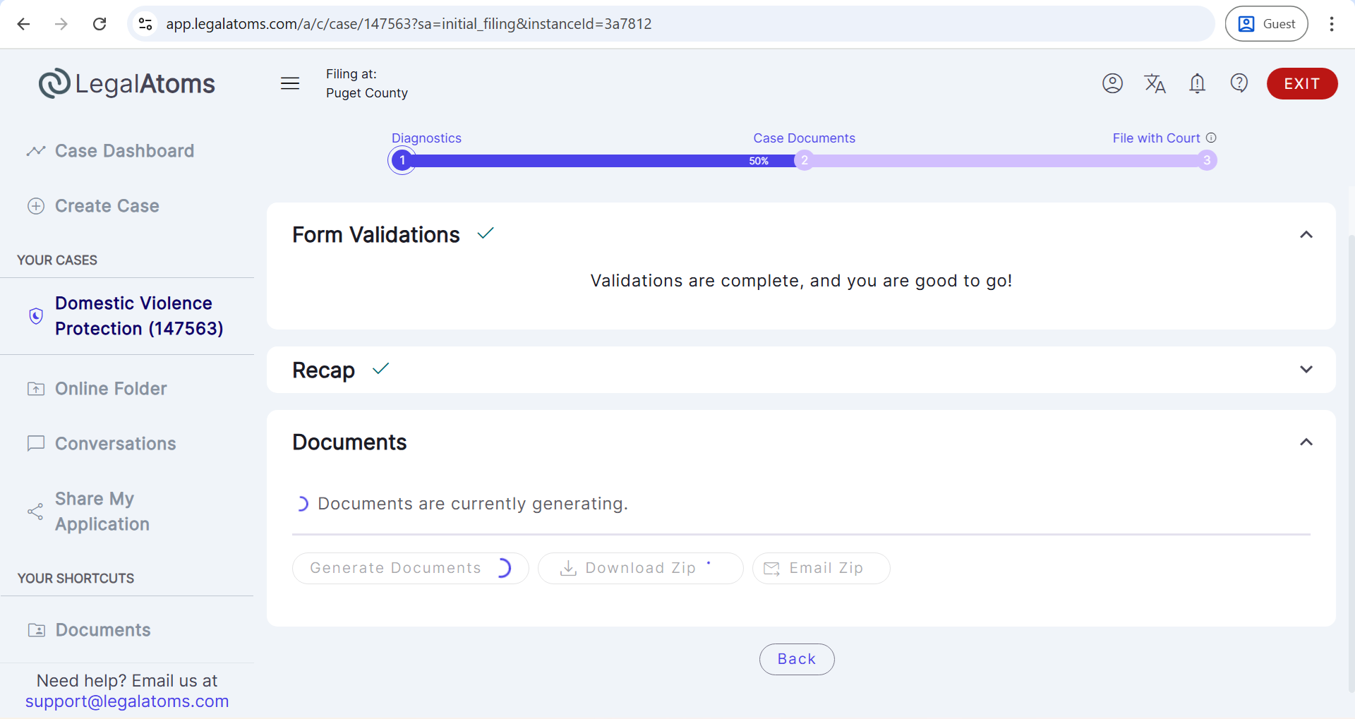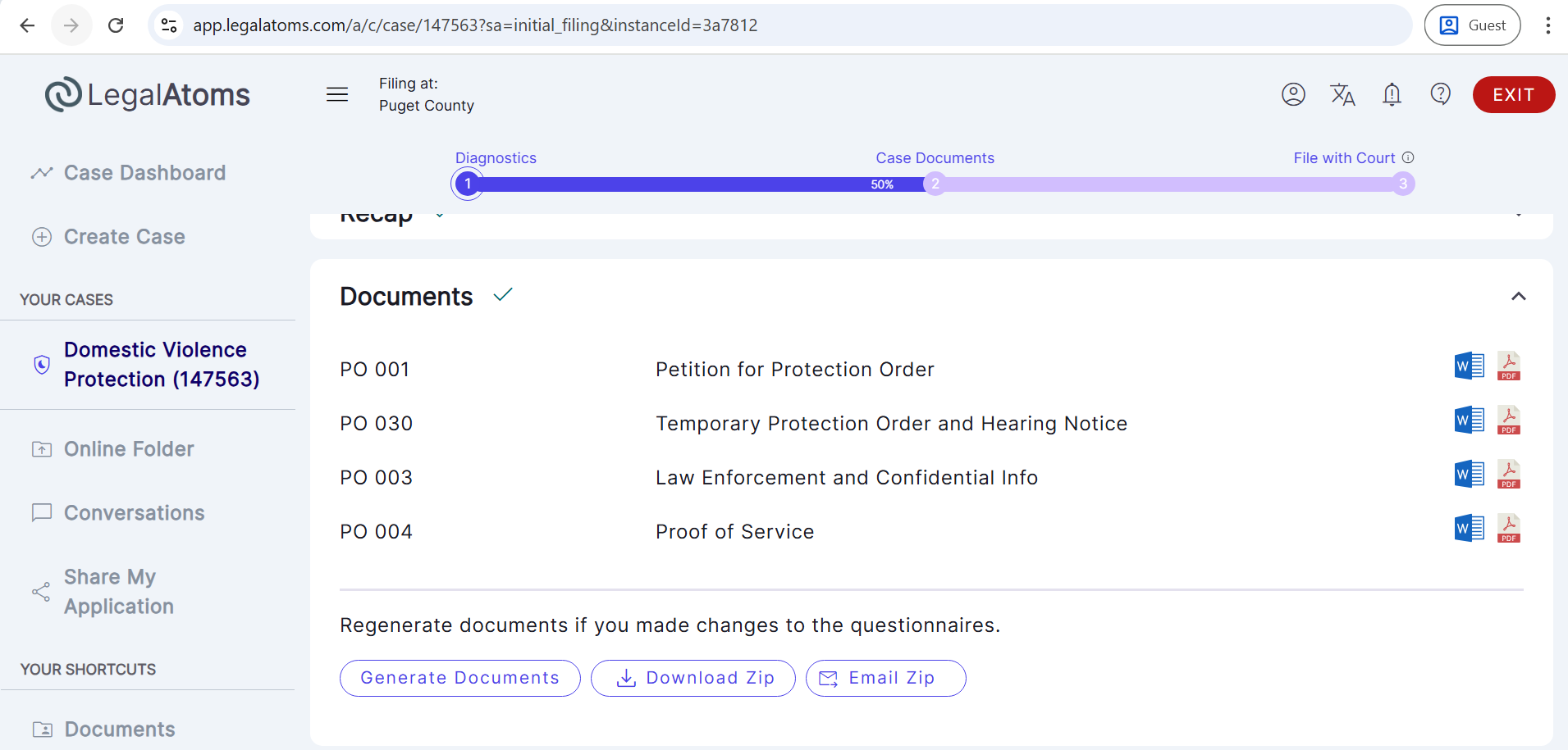 - Upon clicking Next, the required court documents are automatically generated by the system.