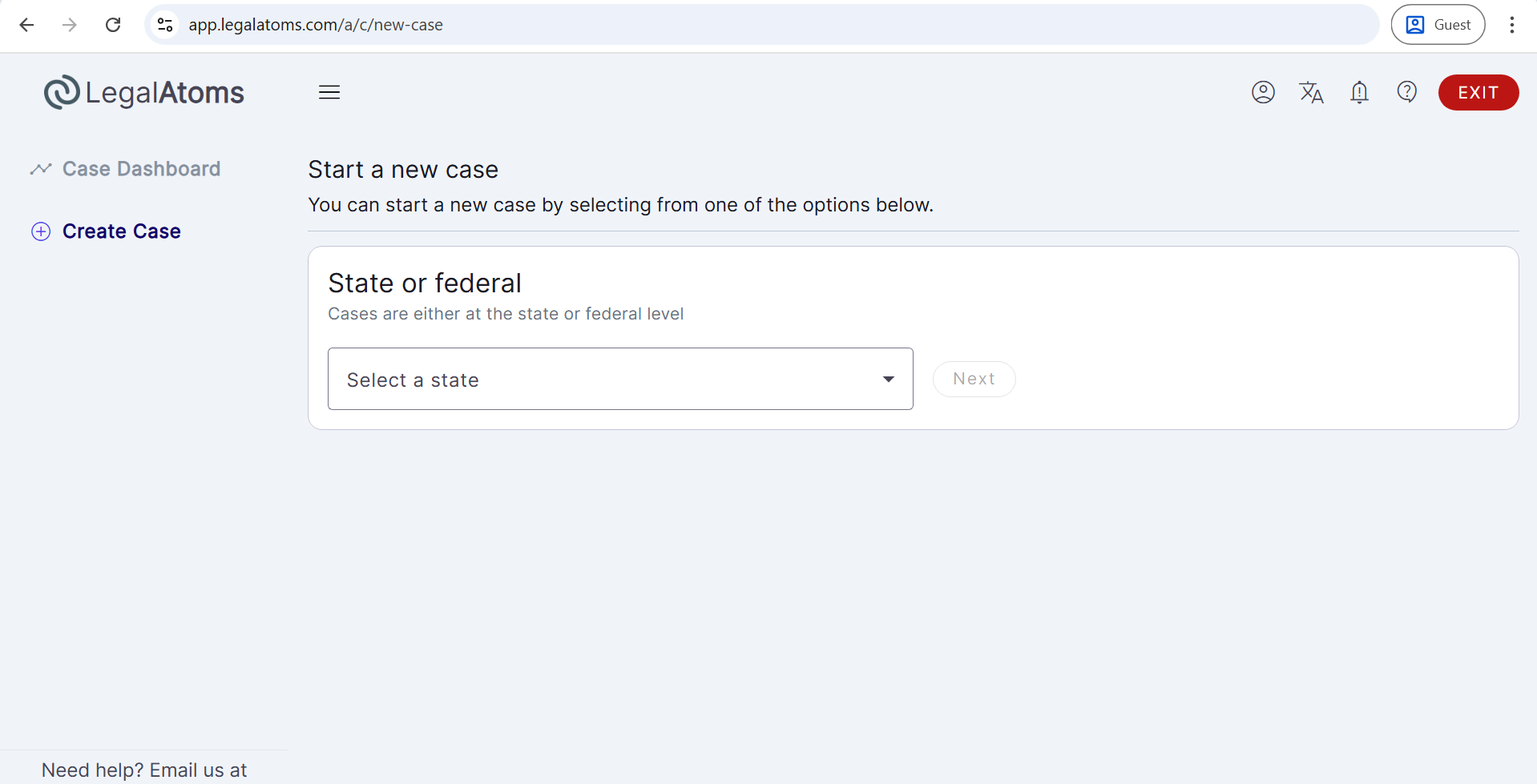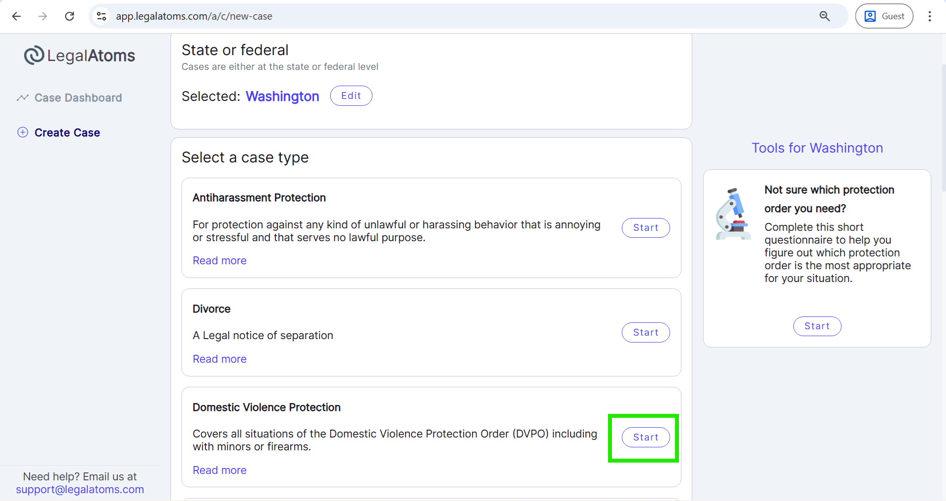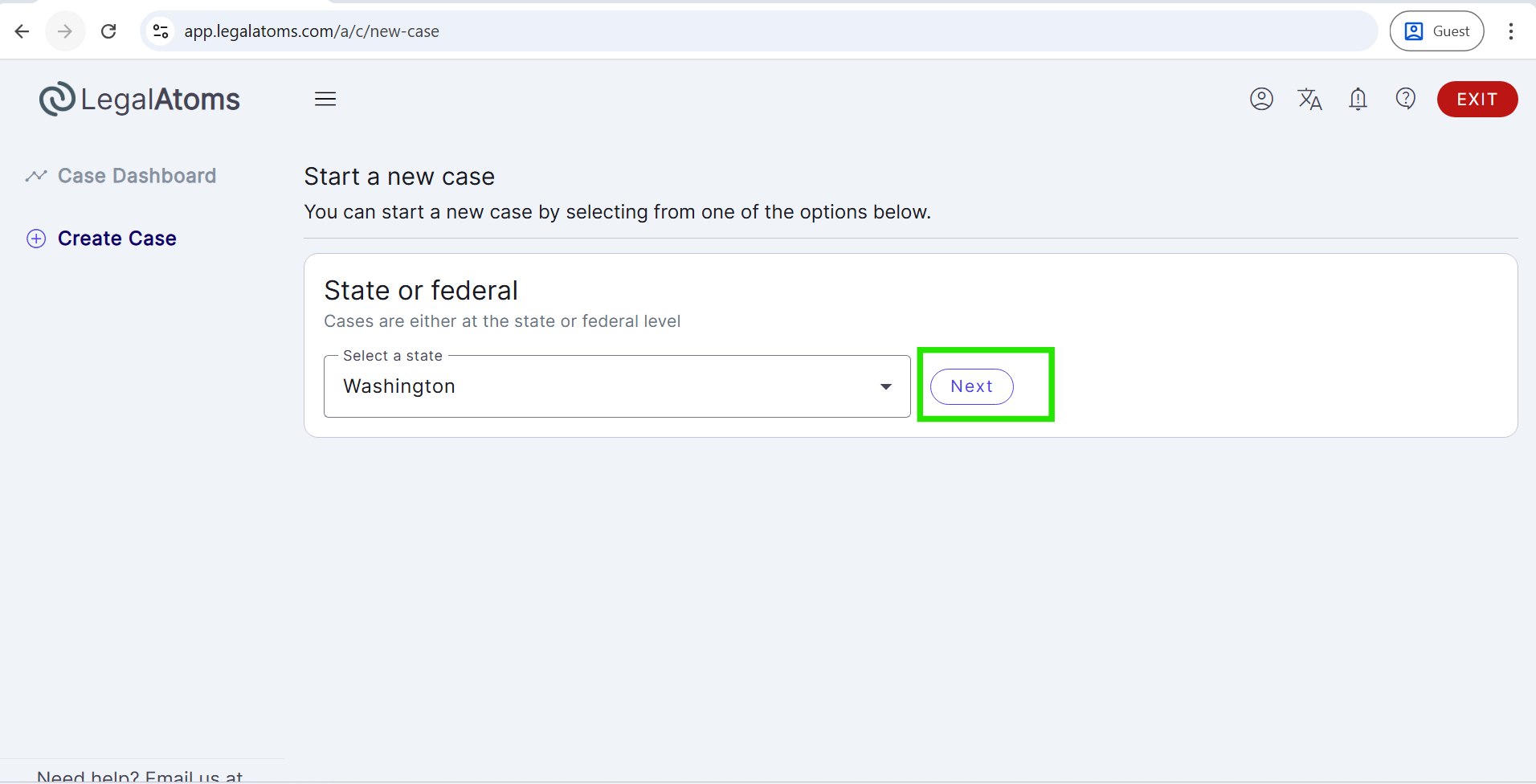 - From the Create Case page, select the State (e.g., Washington), then click Next.