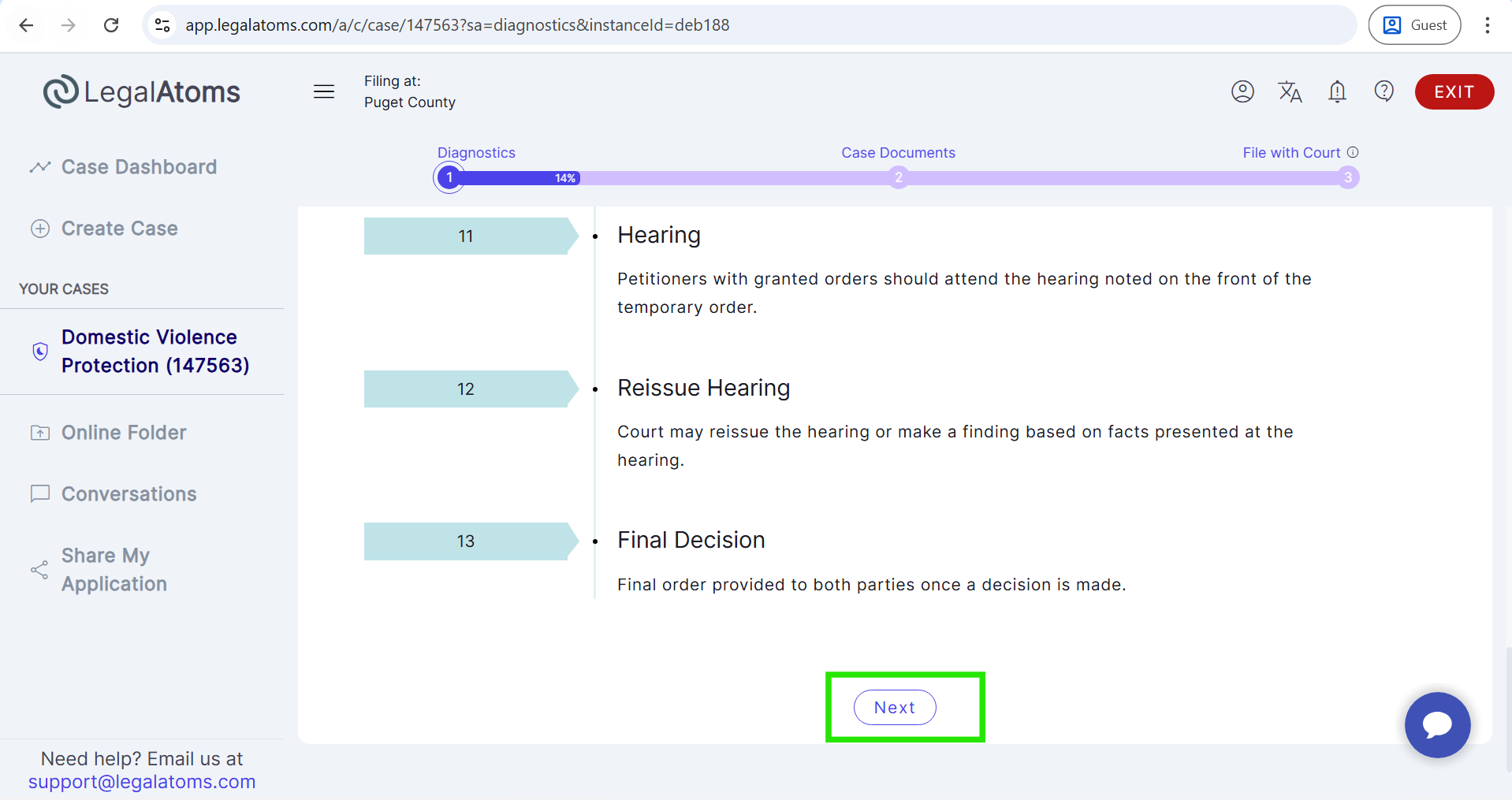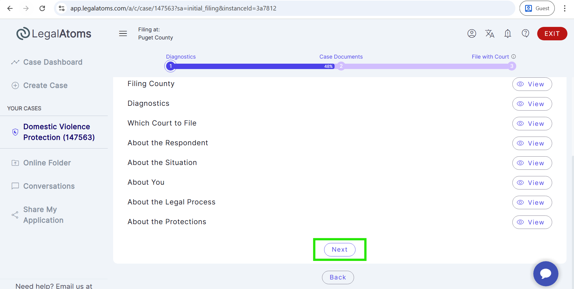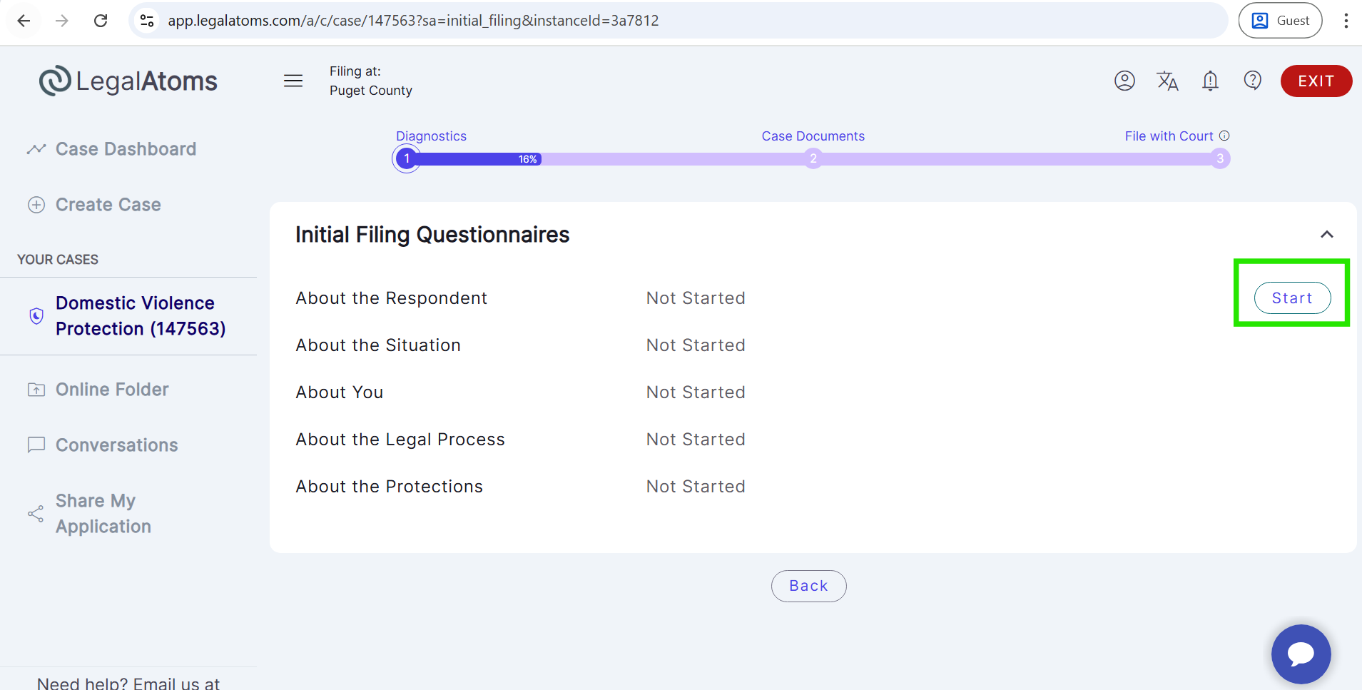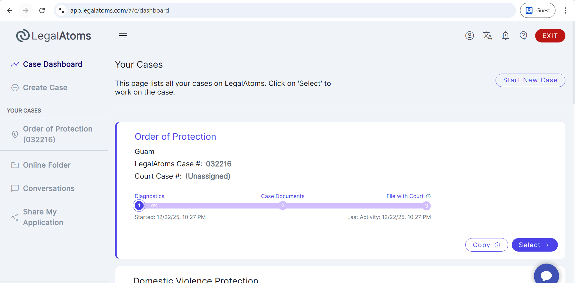 - Then, select the case type (e.g., Domestic Violence Protection).