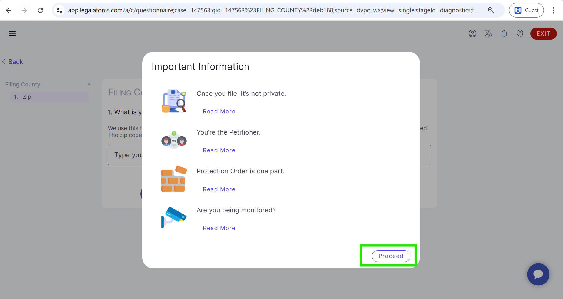 Then, the Important Information pop-up appears, click Proceed, and enter the county ZIP code.