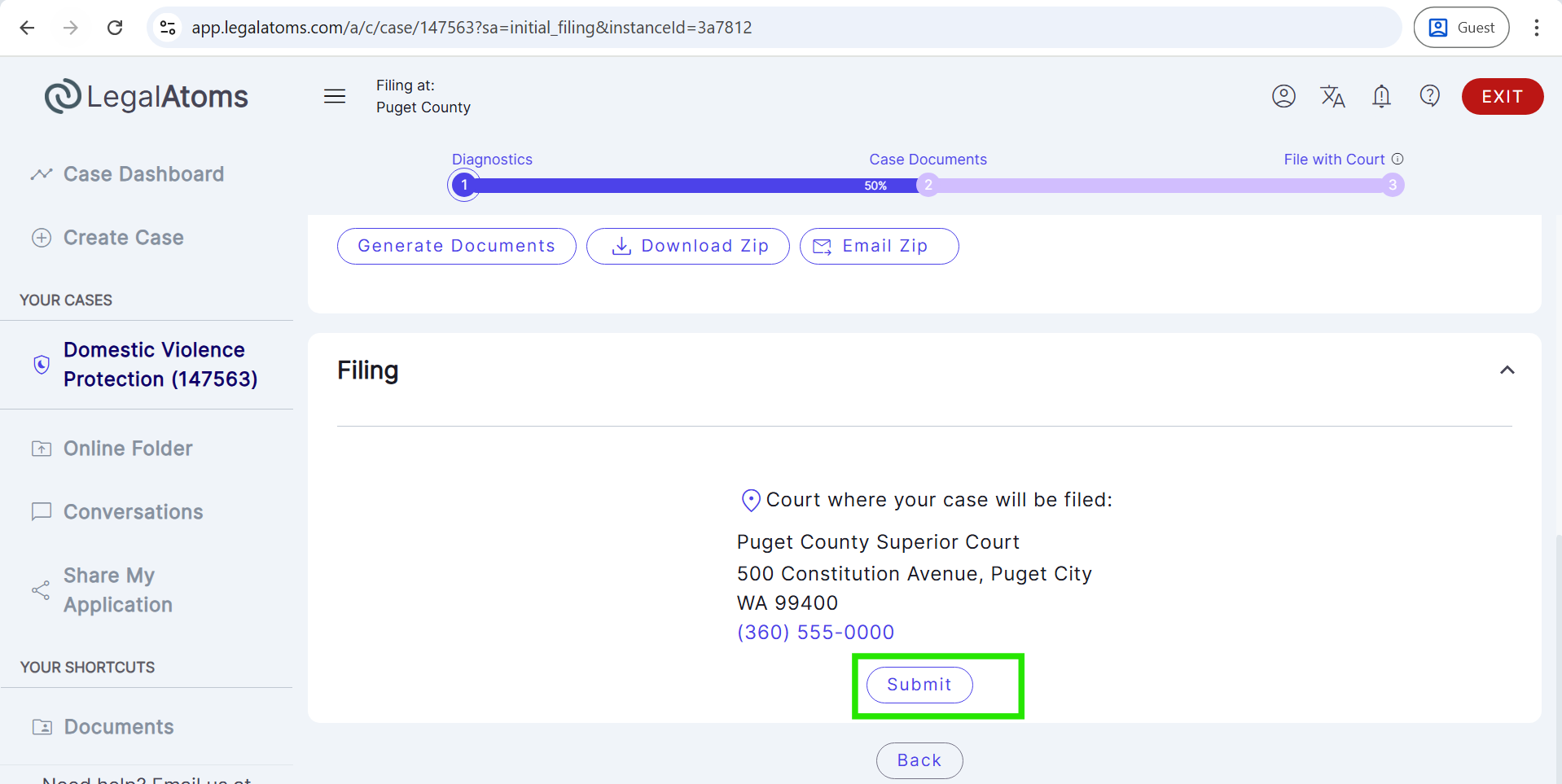 - Click the Submit button to e-file the case with the court clerk.