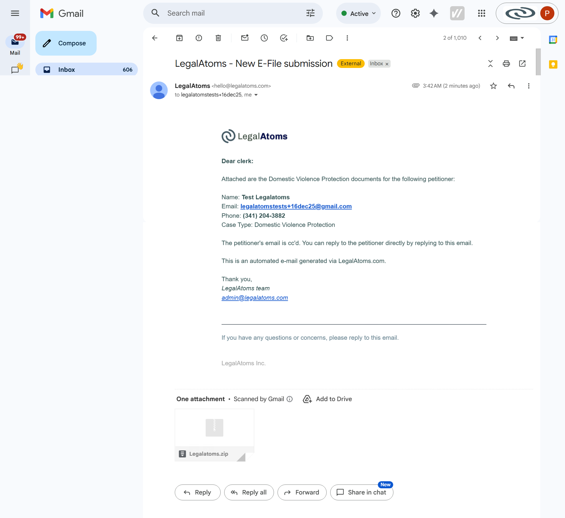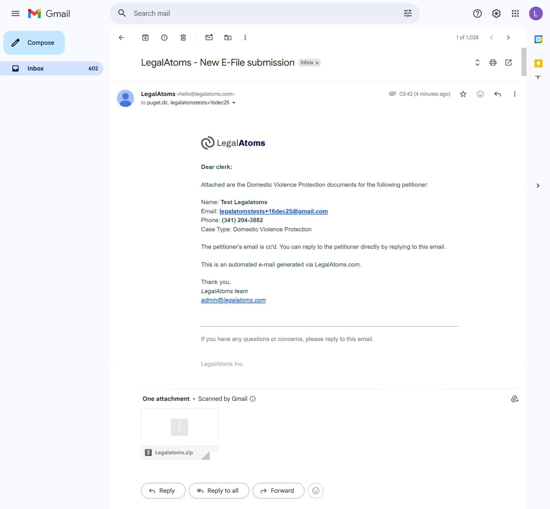 - After successful e-filing, an e-file submission notification email is sent to both the court clerk and the client with an attached zip document.