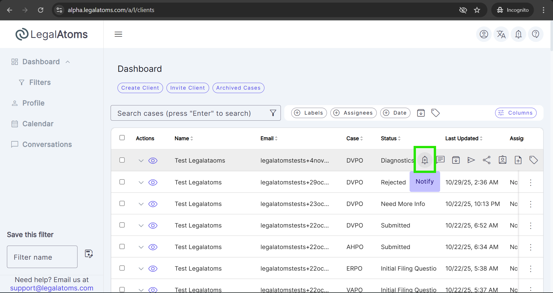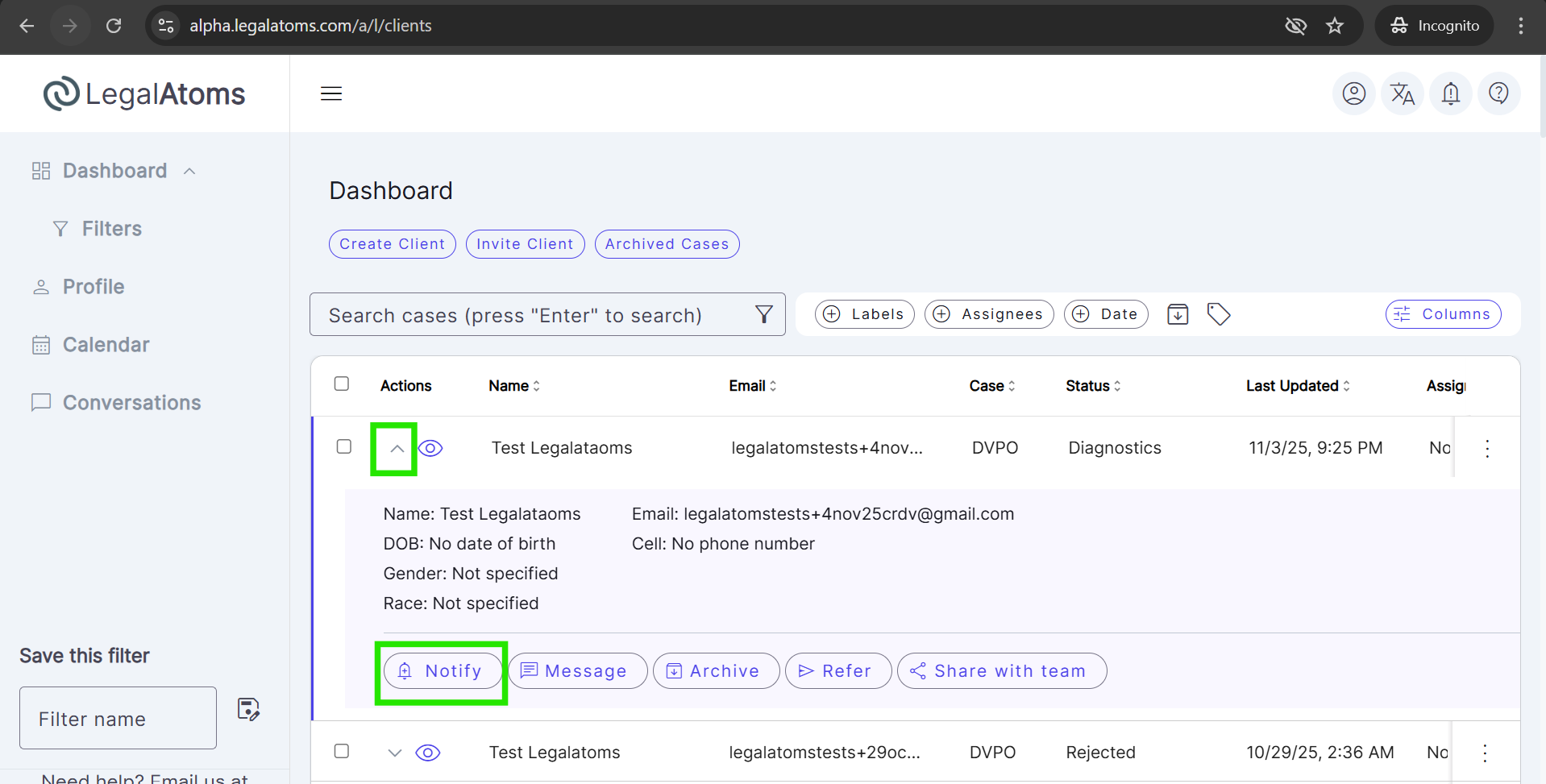 Click the arrow icon to expand the row. A Notify button will appear. Click on it.