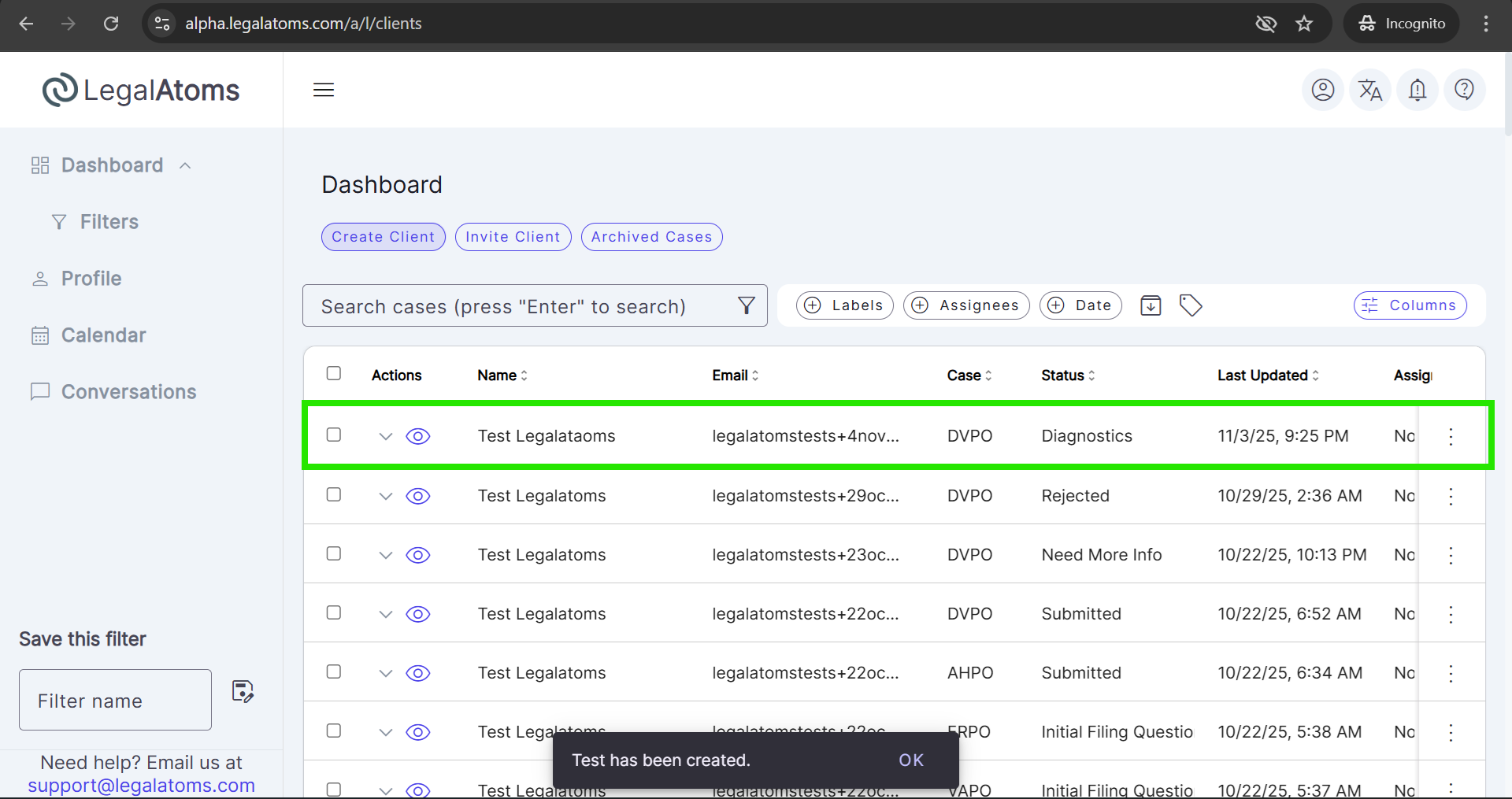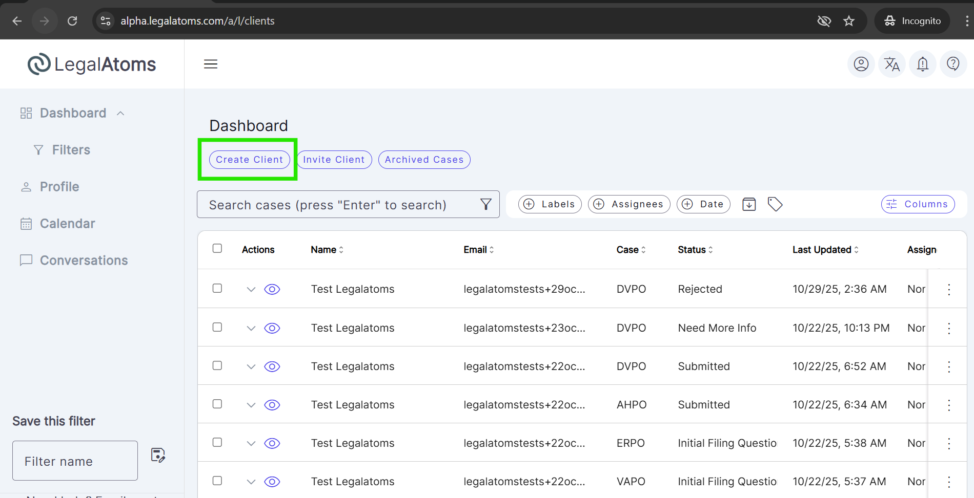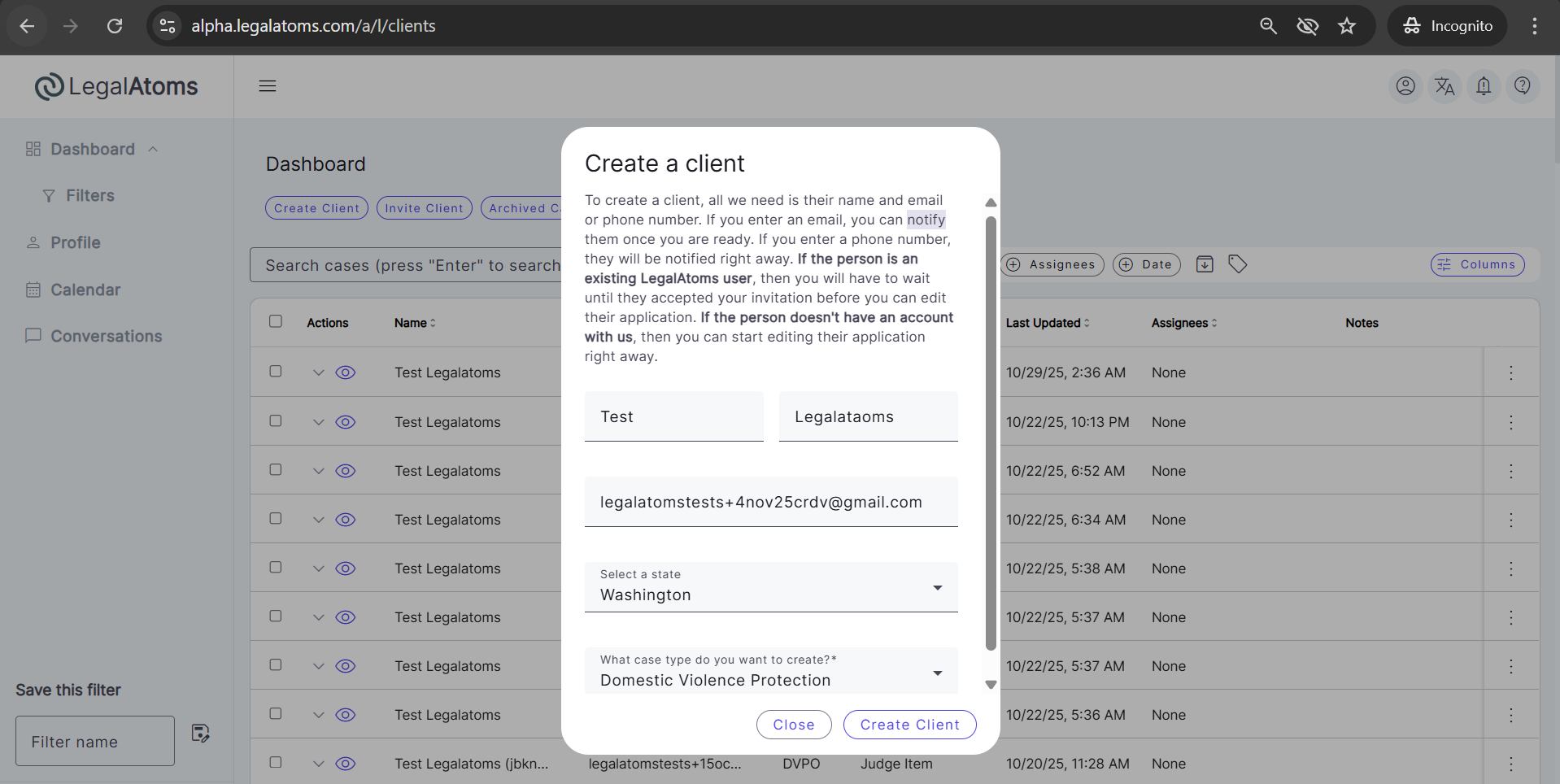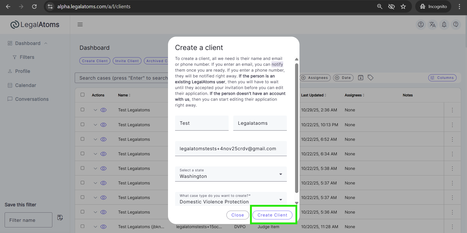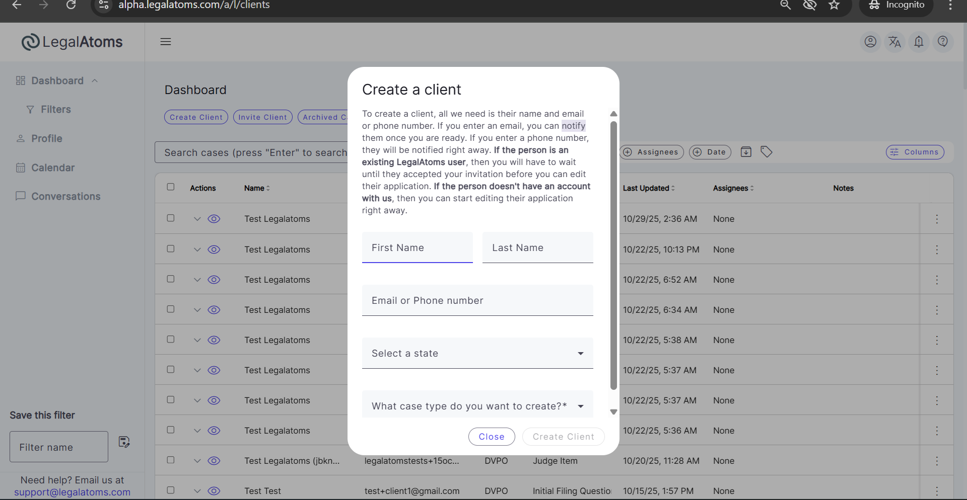 Step 2: Enter the Client name, and email or phone number, select the state, and case type.