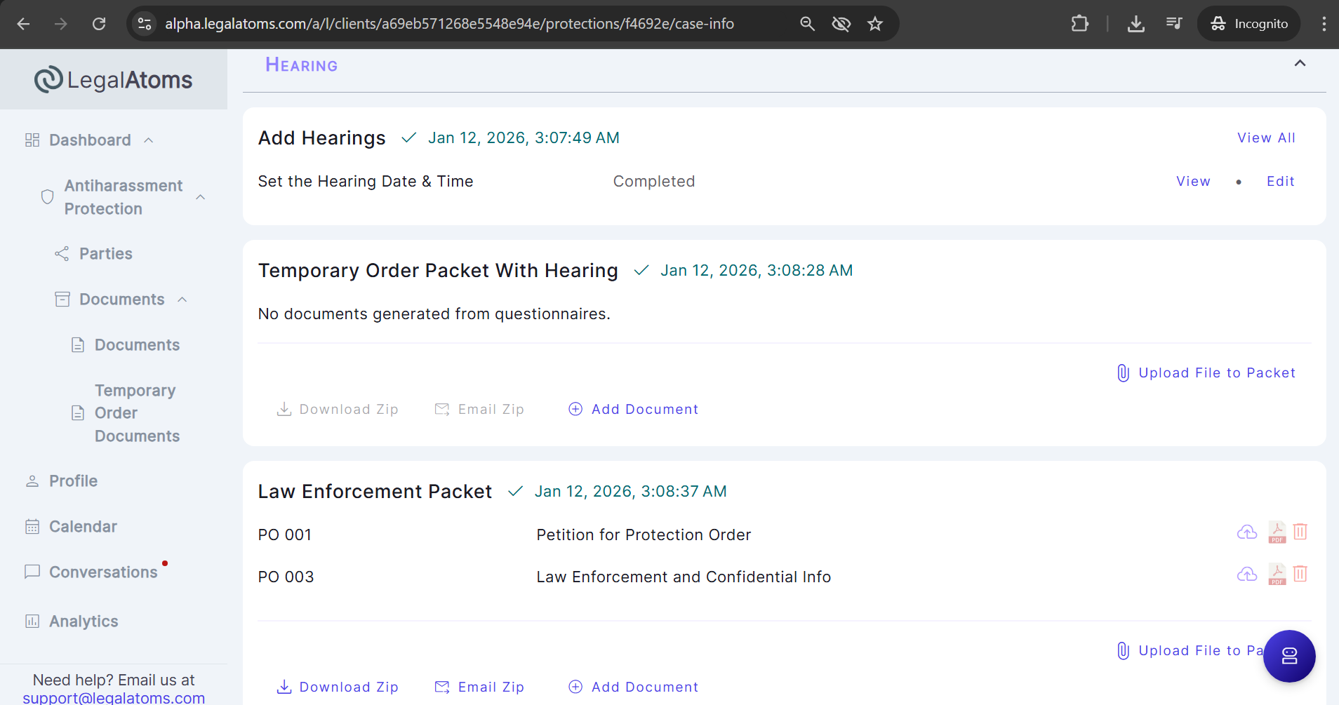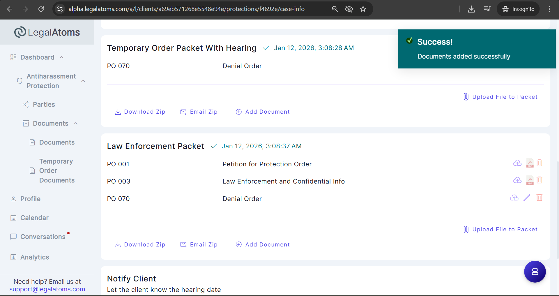 We never generate any missing LegalAtoms documents for uploaded cases. If no document is generated in the (Temporary Order Packet With Hearing, and Law Enforcement Packet), the judge/clerk can add it via the “Add document” button.